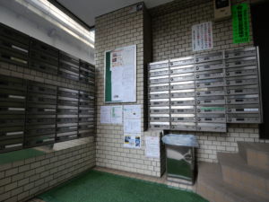 ゴミ箱設置のあるポスト。お知らせなどは掲示板で確認します。